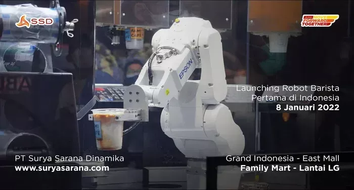 Family Mart merilis sebuah robot barista di Grand Indonesia hari, Sabtu 8/1/2022. Robot barista Fami ....