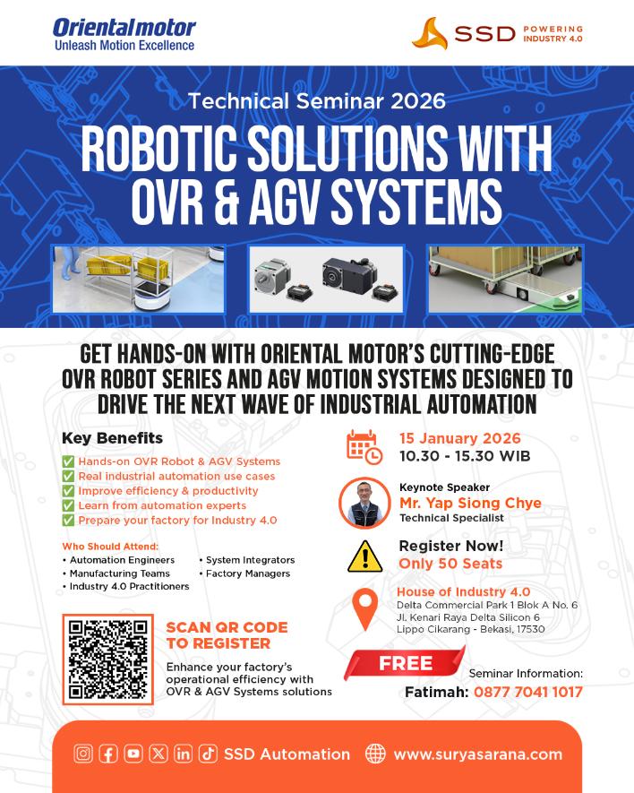 Rasakan langsung bagaimana OVR Robot Series dan AGV Motion Systems dari Oriental Motor menghadirkan solusi otomasi industri yang cerdas, efisien, dan skalabel—dirancang untuk mendukung perjalanan Anda menuju Smart Manufacturing & Industry 4.0.